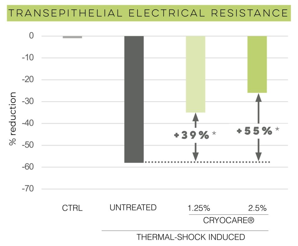 Under cold-to-heat stress, untreated epithelia lost ~60 % TEER, showing severe barrier disruption. With CRYOCARE®, TEER was preserved in a dose-dependent manner, confirming its ability to maintain epidermal cohesion and limit water loss during thermal shocks.